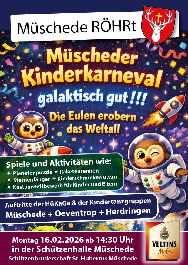 Die Schützenbruderschaft St. Hubertus Müschede veranstaltet auch am Rosenmontag dieses Jahres (16.02.2026) ab 14.30 Uhr in der Müscheder Schützenhalle wieder ihren traditionellen Kinderkarneval.