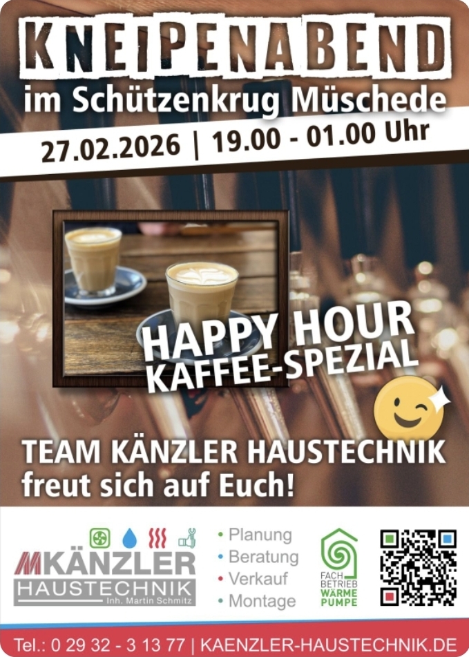 Fa. Känzler Haustechnik hat einen leckeren KAFFEE-Spezial für Euch gezaubert. Natürlich gibt es auch frisches Veltins, Kölsch und andere leckere Kaltgetränke. Im Rahmen dieses Kneipenabends findet ebenfalls der Neubürgerstammtisch statt.